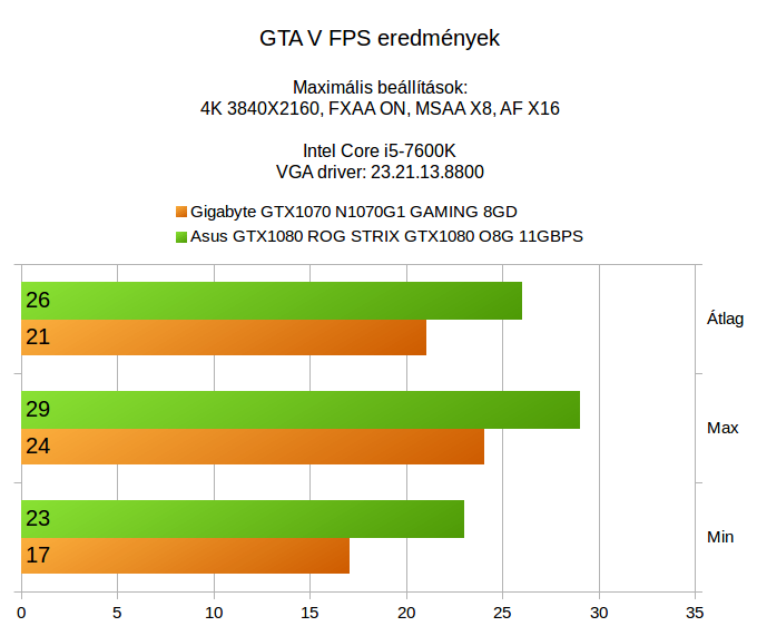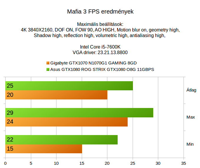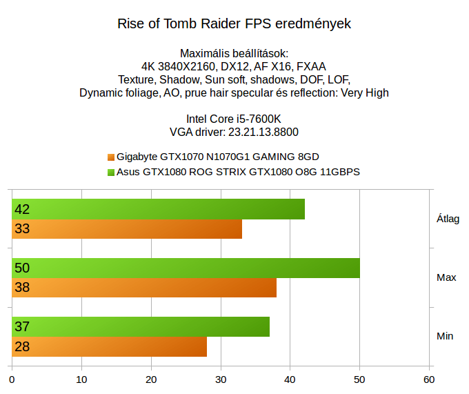A korábbi GTX1070 4K teszthez érkezett olyan vélemény is a Facebookon, hogy médium beállításokkal 4K alatt még a GTX1060 is elboldogul a játékokkal, ezt azért érdemes fenntartással kezelni. Egyrészt nem azért vesz valaki drága gépet és monitort, hogy utána nagyfelbontásban nézze a recéket, másrészt erõsen játékfüggõ, hogy mi az ami szépen elfut és mi az ami csak döcög a Full HD-nál lényegesen több pixel megjelenítése közben. A DOOM ugye hagyományosan egy programozói álom, ami szinte bármin elfut és már egy GTX1060-nal is szépen fröcsög a vér akár 4K alatt is, míg a GTA V és a Mafia 3 azok a játékok, amik azért megkérik a vasat és minél több pixelt számoltatunk velük, annál inkább érvényesül ez az ökölszabály, ezért hiába a sok pixel, az effekteknél kompromisszumot kell hozni, nem beszélve a Tomb Raiderrõl, ahol még több órányi dzsungelben csatangolás után sem áll össze Lara haja, vagy nem képes felvenni egy sapkát vagy kendõt, hogy ne látszódjanak a csibókos fürtök, ezért a hajszálak folyamatos számolgatása szépen megeszi a teljesítményt (hihetetlen, hogy még virtuálisan is ennyi nyûg van egy nõ hajával).