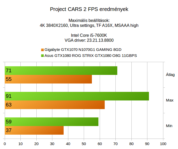 A kérdés tehát, elegendõ egy GTX1070 4K felbontáshoz? Nos, van ahol igen, de nyugodt szívvel, minden játékhoz azért nem ajánlanánk. Elég csak megnézni a két ominózus játékot, hiszen ha valakinek fontos a GTA V és a Mafia 3 alatti teljesítmény és szeretné ezeket a játékokat teljes pompájukban élvezni 3840x2160 megjelenített pixel mellett, akkor bizony karcsú lesz egy GTX1070. A Battlefield 1, DOOM és Project Cars 2 már szépen elfut egy GTX1070 kártyával is, de ha az ideálisnak mondható 60 képkocka a cél, akkor azok a játékok is stabilabban hozzák az elvárt eredményt egy GTX1080 kártyával.
