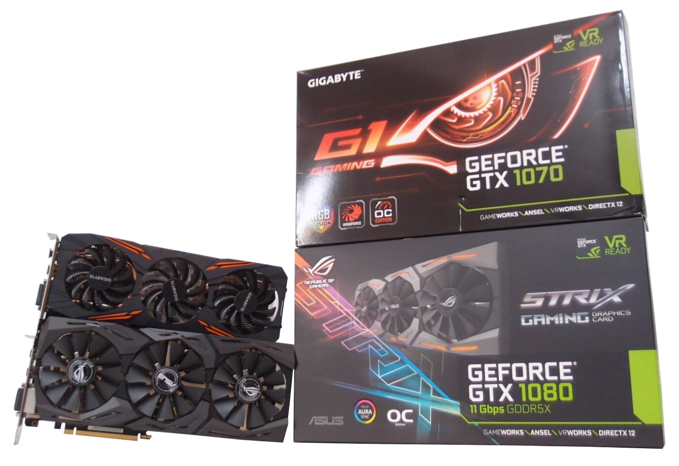 Asus GTX1080 8GB GDDR5X ROG-STRIX-GTX1080-O8G-11GBPS videokártya és Gigabyte GTX1070 8GB DDR5 GV-N1070G1 GAMING-8GD videokártya