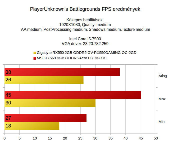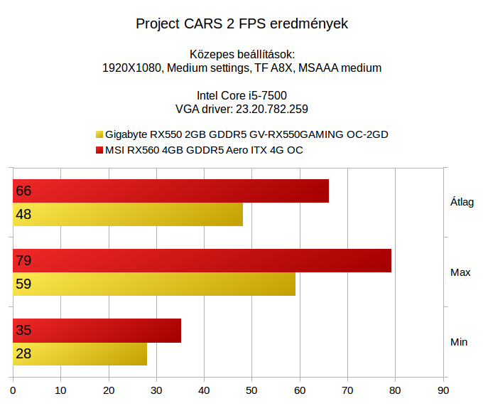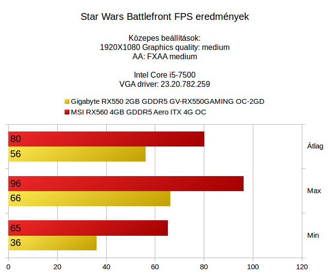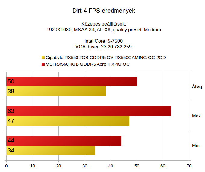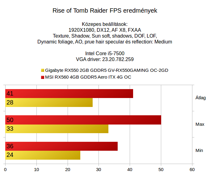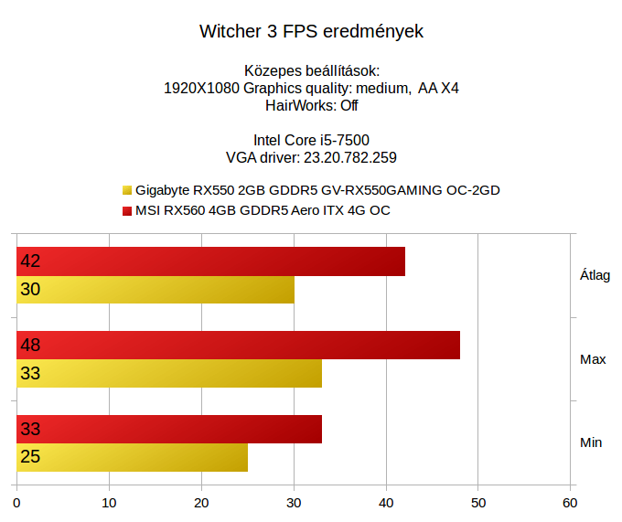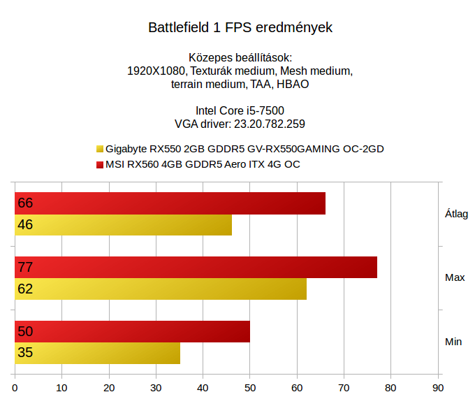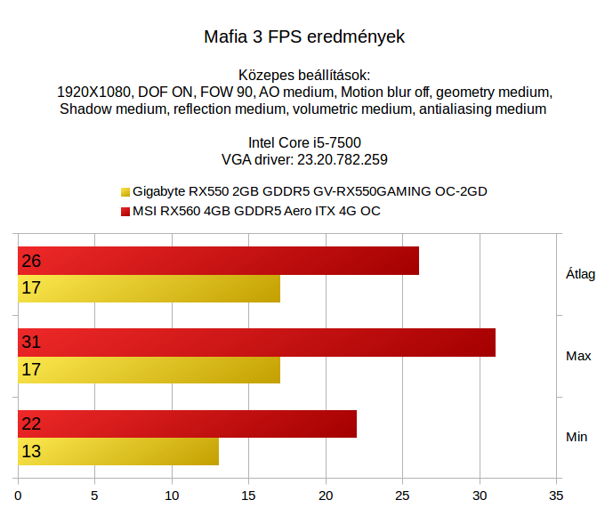 Tekintve, hogy az aktuális VGA generáció két belépõ kártyájáról beszélünk, no meg a 2GB nem minden játékban elég nagyobb részletesség mellett, ezért a játékokat közepes beállítások és Full HD mellett teszteltük. Az azért jól látszik, hogy a közepes beállítások az igazi terepei ezeknek a kártyáknak, nem nagyon érdemes magasabb beállítások melett játszani, mint ahogy az is elég egyértelmû, hogy az RX560 lényegesen erõsebb, mint a kistesó.