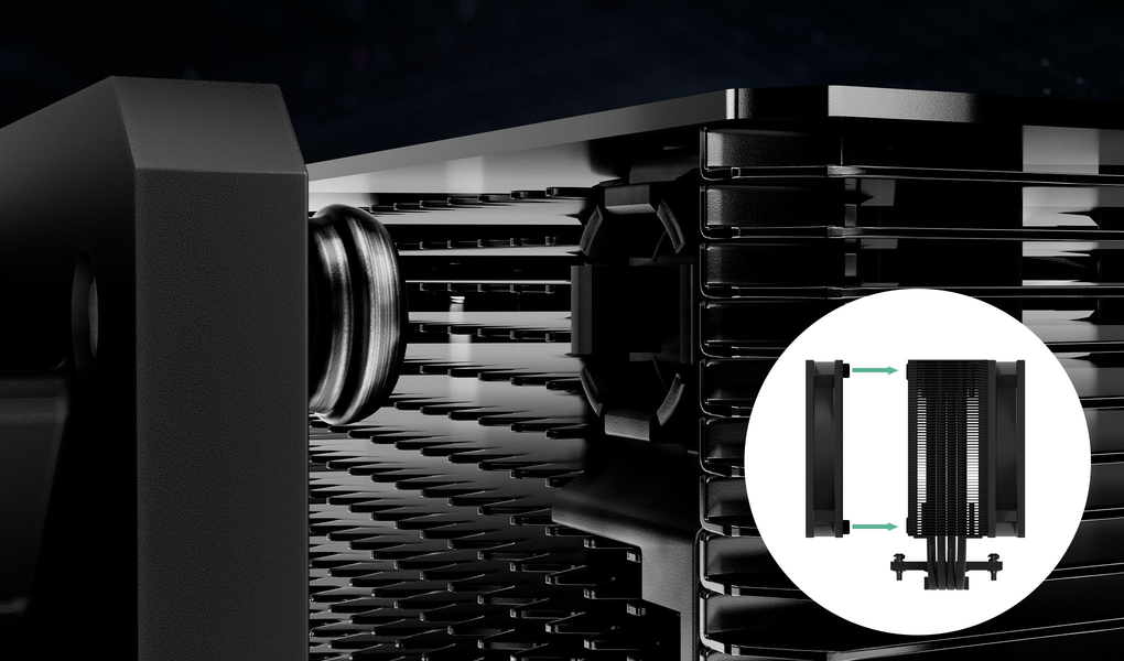 A hűtőborda lemezei oldalt nyitottak, és lehetővé teszik a ventilátor számára, hogy további hideg levegőt szívjon ki a számítógép házából a hűtőbordán keresztül. Ez az oldaláramú kialakítás még hatékonyabb szellőzést tesz lehetővé.