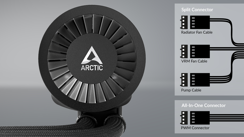 All-in-One: A Liquid Freezer II-hez hasonlóan ez is lehetővé teszi a teljes egység egyetlen csatlakozáson keresztüli vezérlését, ami által a hűtőventilátorok sebessége kerül a kimenetre. A szivattyú, a VRM és a hűtőventilátorok ezért egyszerűen vezérelhetők egyetlen PWM beállítással.