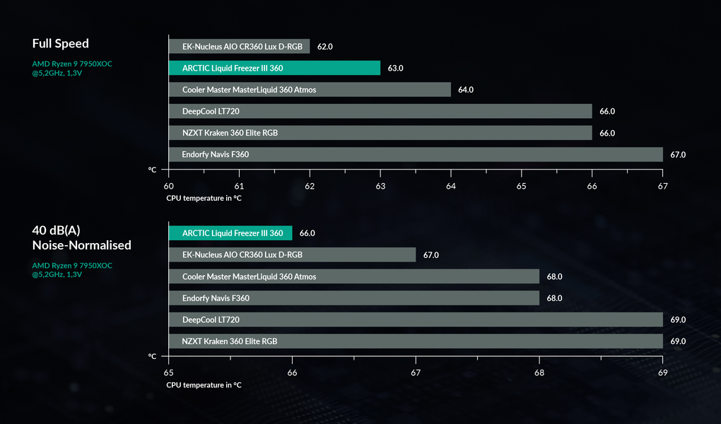 A független tesztek során a Liquid Freezer III minden árkategóriában egyértelműen kiemelkedik a versenytársak közül, különösen kiemelkedő teljesítményének köszönhetően. A normalizált zajtesztek során a Liquid Freezer III megmutatja valódi erejét, csendes, de erőteljes működésével sok versenytársát felülmúlja.
