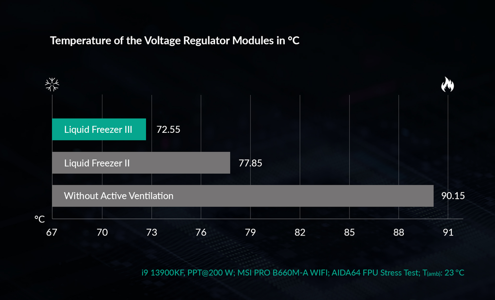 Az alaplapok feszültségátalakítói gyakran a maximális hőmérsékleten működnek, energiaéhes processzorokkal kombinálva. A toronyhűtőből származó légáramlás hiányának kompenzálására a Liquid Freezer III egy átdolgozott VRM ventilátorral működik. A 60 mm-es PWM vezérlésű ventilátor szinte csendes hűtést tesz lehetővé a csatlakozóaljzat területén, ha a VRM hűtés nem elegendő, gyenge légáramlás vagy különösen túlhúzás esetén. Ez folyamatosan nagyobb terhelést és hosszabb élettartamot tesz lehetővé a feszültségátalakítók számára.