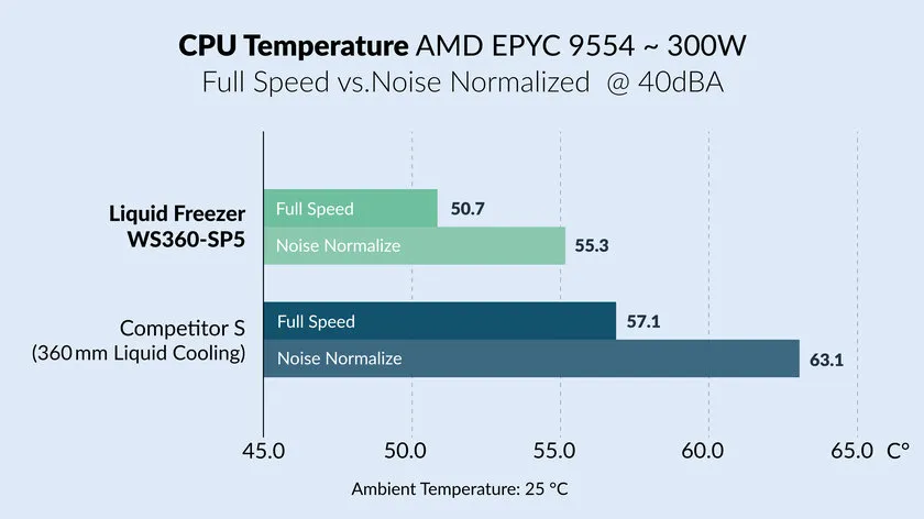 A radiátor kialakításának és a nagy teljesítményű ventilátoroknak köszönhetően a Liquid Freezer WS360-SP5 kiemelkedő hűtést biztosít nagy terhelés mellett is, miközben a zajszintet a versenytársak megoldásaihoz hasonló szinten tartja.