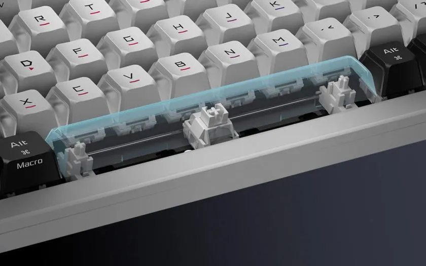 A szóköz billentyű extra kenést és speciális módosításokat kapott, hogy a hangja és a lenyomásérzete is még jobb legyen. Alatta ráadásul öt RGB LED kapott helyet, amelyek lenyűgöző fényeffektusokra képesek.