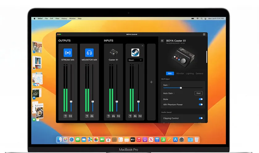 A számítógépen futó, intuitív BOYA Central PC szoftverben módosíthatod a visszajelző fények színeit, virtuális csatornákat adhatsz hozzá, valamint engedélyezheted az olyan funkciókat, mint az EQ vagy az anti-clipping, mindezt anélkül, hogy elhagynád a munkakörnyezetedet.