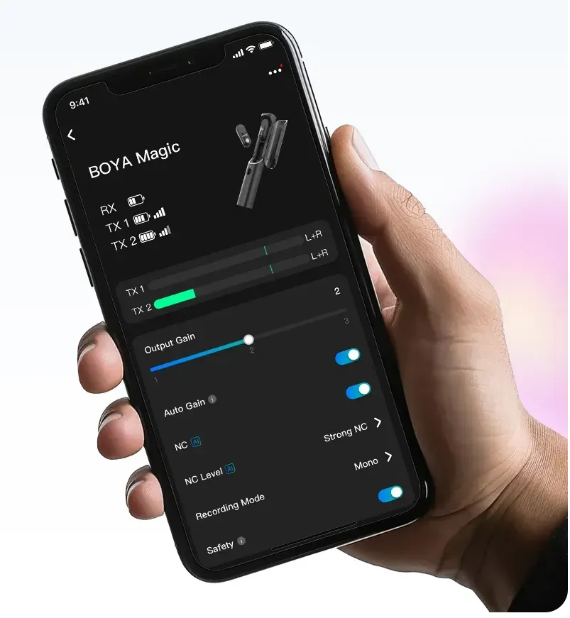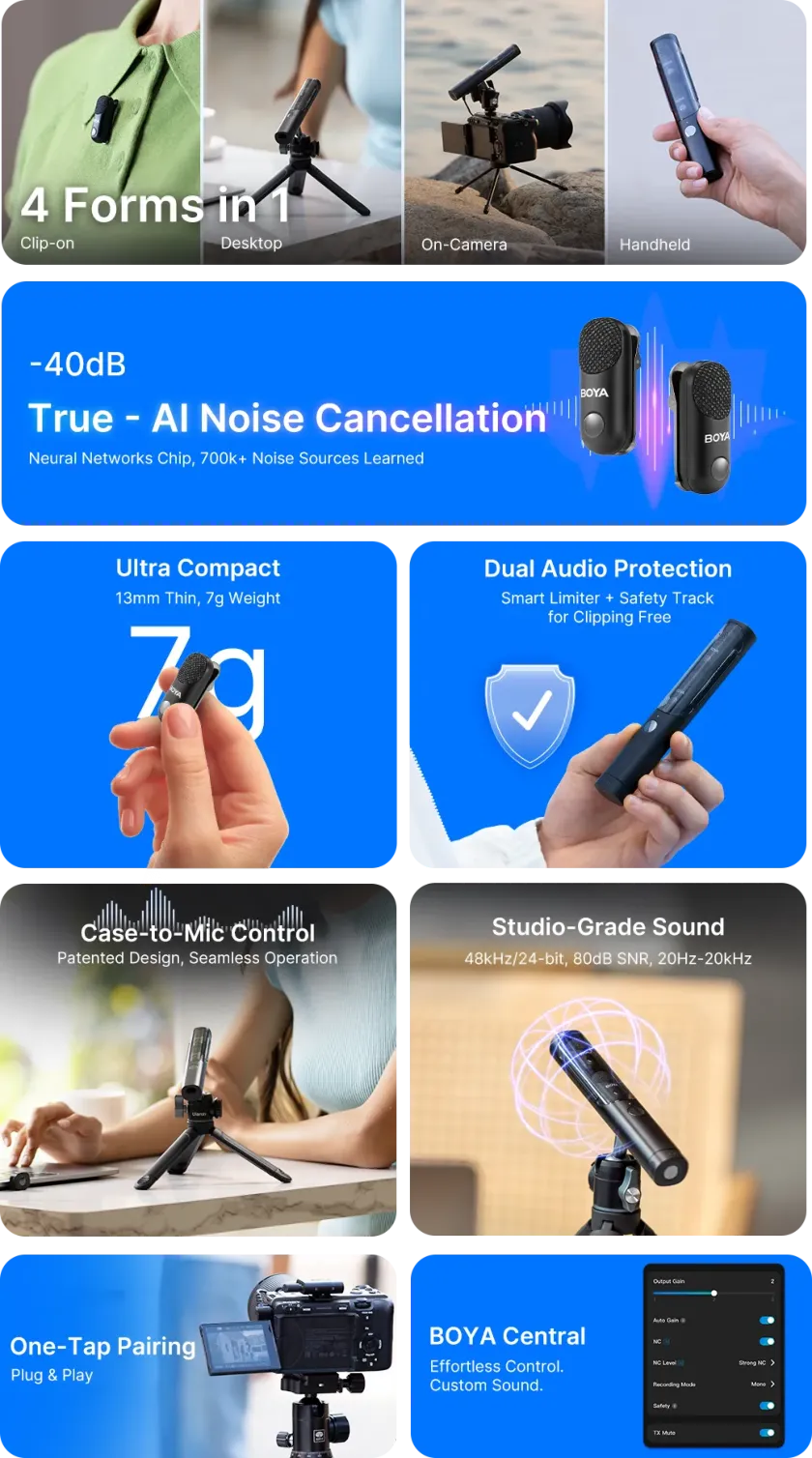 A BOYA Magic egy mesterséges intelligenciával működő neurális hálózati chippel rendelkezik, amelyet több mint 700 000 hangmintán és 20 000 órányi mélytanuláson tanítottak be, hogy valós időben azonnal azonosítsa és elnyomja a különféle zajokat, akár 40 dB-es zajszűrést biztosítva. A hagyományos zajszűréssel ellentétben sebészeti pontossággal eltávolítja a zavaró tényezőket anélkül, hogy elvékonyítaná vagy torzítaná az énekhangot – a hangja természetes és stúdióéles marad még káoszban is.