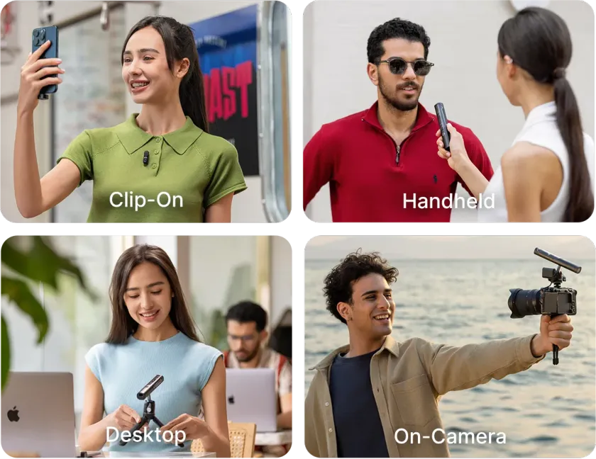 Válts zökkenőmentesen a vezeték nélküli csíptetős mikrofon (tökéletes vlogoláshoz), a kézi interjúbot (ideális utcai tudósításhoz), az asztali mikrofon (tiszta podcasting) és a kamerára szerelt mikrofon (filmes hang) között. Nincs szükség extra felszerelésre, nincs időpazarlás.