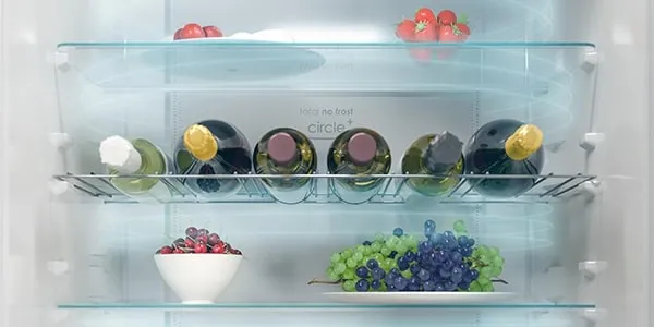 A Total No Frost Circle + technológiának köszönhetően az állandó és homogén hőmérséklet, valamint a páratartalom garantált a hűtőszekrény minden polcán és sarkán. Az oldalsó légáramlás, amely az oldalsó nyílásokból érkezik, hosszabb ideig frissen tartja az ételt, bárhol tárold is azt a hűtőszekrényen belül. *Független külső műszaki laboratórium által kiadott vizsgálati eredmények, amelyek egy Total No Frost Circle + technológiás hűtőszekrényt hasonlítanak össze egy közvetlen áramlású technológiás hűtőszekrénnyel.