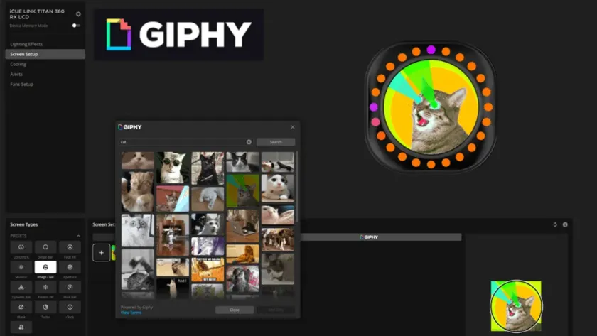Örömmel jelentjük be az alkalmazáson belüli integrációt a GIPHY-vel, az animációk, videoklipek és egyéb válogatott tartalmak elsődleges forrásával, amelyek gyorsan és egyszerűen alkalmazhatók a TITAN RX LCD kijelzőn az iCUE-ban, mindössze néhány kattintással. Az alkalmazáson belüli keresés azt jelenti, hogy könnyedén megtalálhatod, letöltheted és elmentheted a kiválasztott GIF-et vagy animációt, vagy hangulatot, amikor csak kedved szottyan hozzá.