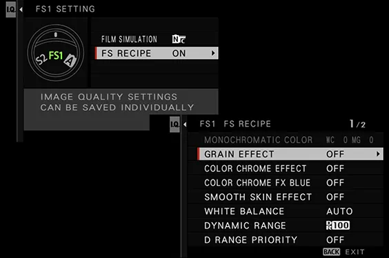 Az újonnan tervezett filmszimulációs tárcsa precíziósan vágott kijelzőablakkal rendelkezik, amely a pontos kivitelezés érdekében minimalizálja a tárcsa és a váz közötti rést. Ezenkívül a Filmszimulációs és képminőségi beállítások egyénileg beállíthatók az FS1-FS3 pozíciókba, így elmentheti saját receptjeit.