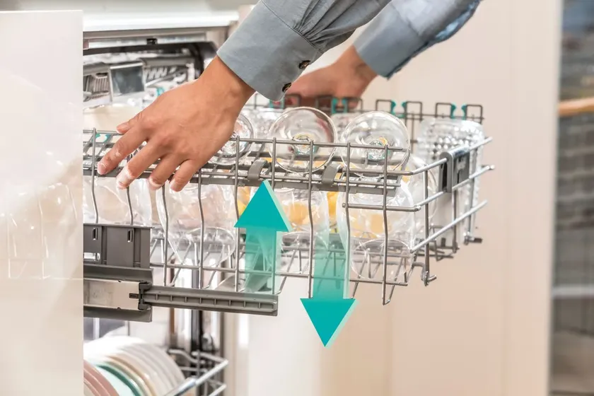 A rendkívül egyszerű, kétfokozatú kosárbeállító rendszer lehetővé teszi a legnagyobb edények és tányérok elhelyezését is. Ezzel a mosogatógép belseje teljesen az aktuális igényeidhez igazíthatóak.