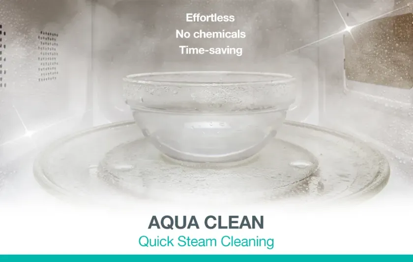 A sütő belsejét egy csapvízzel feltöltött hőálló üveg vagy agyag edény segítségével tudod tiszítani. Mindössze annyit kell tenned, hogy a vízzel teli edényt a sütőbe helyezed és bekapcsolod az AquaClean funkciót. A program során keletkező gőz fellazítja a mikrohullámú sütő falain lévő szennyeződéseket, a végén csak ki kell törölnöd a sütőkamrát egy nedves ruhadarabbal.