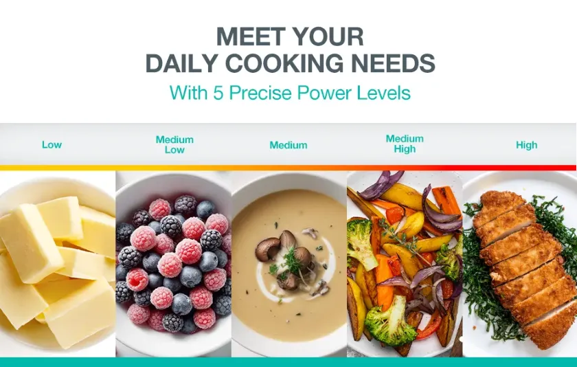 A teljesítményszint 100%, 70%, 50%, 30% vagy 10% értékre állítása lehetővé teszi, hogy a főzést az egyedi igényeidhez igazítsd. A nagy teljesítmény akkor jó, ha a lehető leggyorsabban fel szeretnél melegíteni valamit, például víz forralásához tökéletes. A közepes beállítások lehetővé teszik az ételek párolását vagy sütését, míg az alacsony fokozatok krémes levesek főzésére alkalmasak, és szárításként is működhetnek.