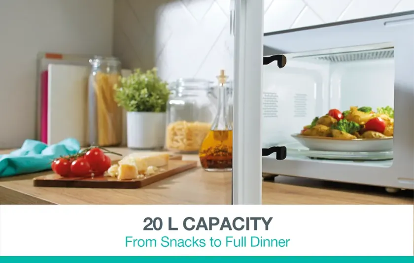 20 literes űrtartalmával ez a mikrohullámú sütő lehetővé teszi, hogy könnyedén elkészíts mindent a gyors harapnivalóktól kezdve a teljes családi vacsoráig. Tágas belső tere nagyobb ételek befogadására is alkalmas, így rugalmasan elkészíthetsz a popcorntól kezdve a kiadós sült húsig mindent. Akár maradékot melegítesz fel, akár friss ételt készítesz, ez a sokoldalú mikrohullámú sütő a te mindenre kiterjedő konyhai segítőd lesz.