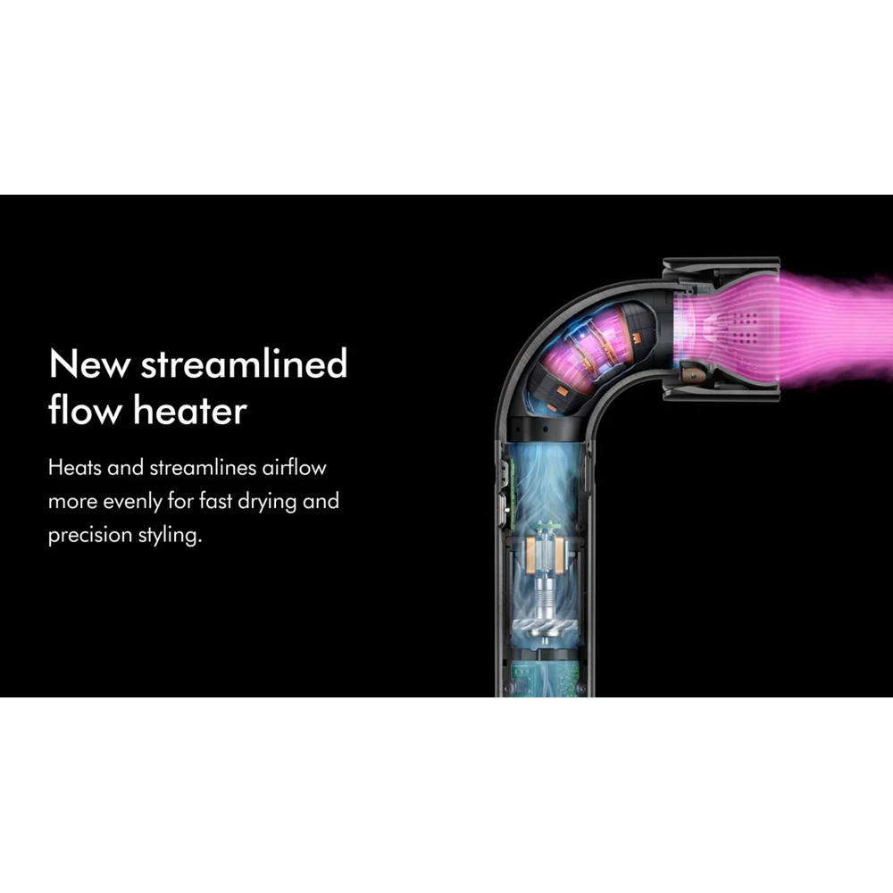 A legerősebb és leggyorsabb szárítóberendezésünk – a Dyson Hyperdymium™ motor nagynyomású légáramlást hoz létre. Akár 110 000 fordulat/perc sebességgel forog, szabályozott légsugarat képezve. A rendkívül érzékeny, áramvonalas áramlású fűtőtesten keresztül 10 fűtőfólia található a készülék ívében, amelyeken keresztül a levegő áramlik.