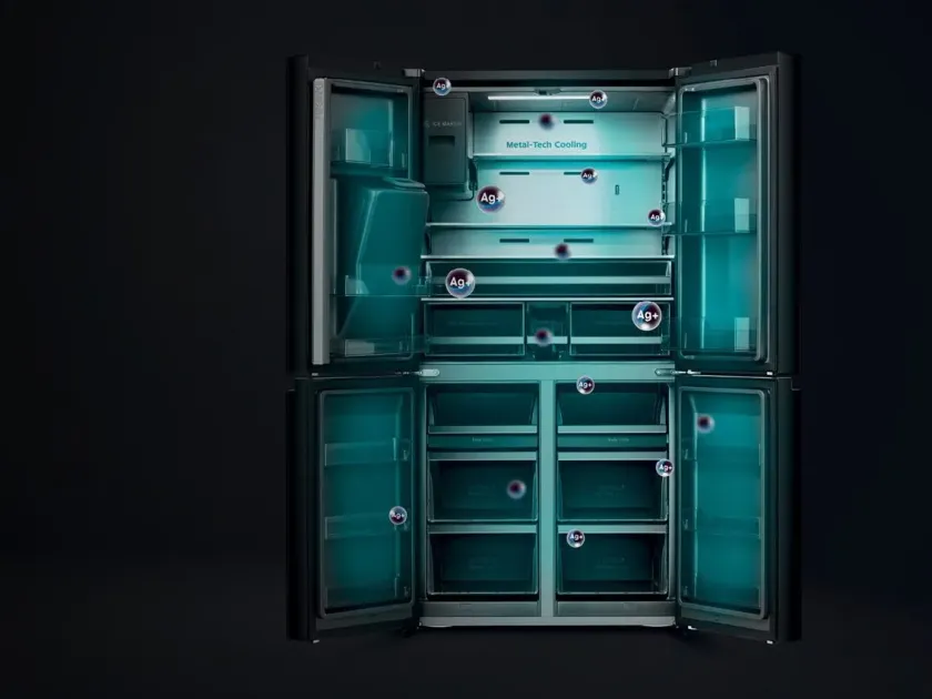 A baktériumok 99,999%-ának eltávolításával ez a hűtőszekrény hosszabb ideig tartja frissen az ételeket. A rendkívül hatékony antibakteriális burkolatnak köszönhetően a hűtőszekrény belseje baktériummentes, így tisztább és egészségesebb a használata.*A 99,999% a TÜV jelentésből származik. Az antibakteriális hatást az ISO 22196-2011 Az antibakteriális aktivitás mérése műanyagokon és más nem porózus felületeken című szabvány szerint tesztelték. A teszt reprezentatív baktériumai a Staphylococcus aureus és az Escherichia coli.
