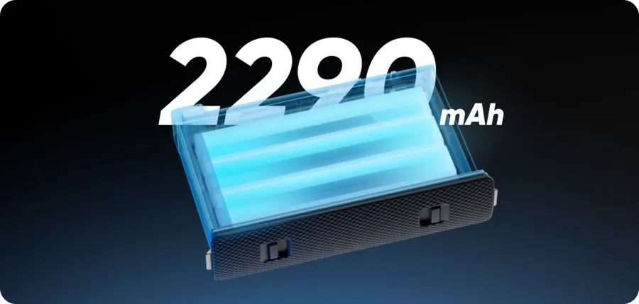 A 2290 mAh-s, nagy kapacitású akkumulátor 135 percnyi felvételt tesz lehetővé 5,7K@30 képkocka/mp sebességgel.