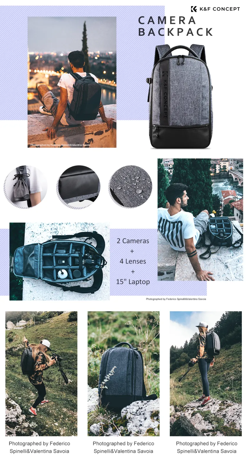Több tárolózseb: Speciális belső zsebek vannak fényképezéshez szükséges alkatrészek, például például szűrők, adaptergyűrűk stb. számára. Vannak benne továbbá rugalmas szalagból készült zsebek kártyáknak, valamit az oldalsó zsebekben állvány és vizespalack is tárolható.