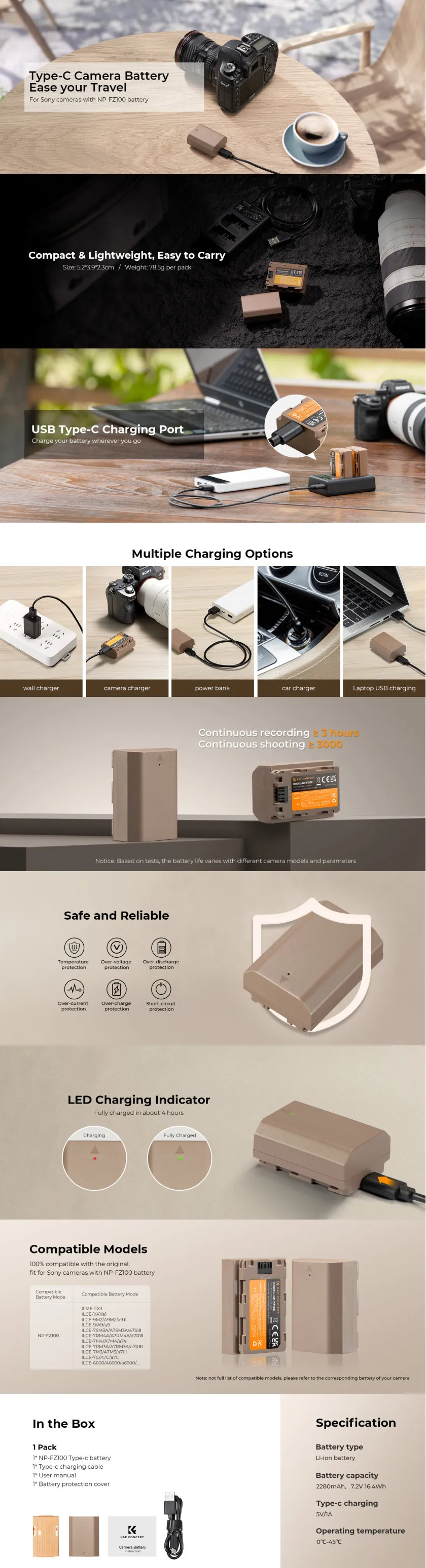 Nagy kapacitású akkumulátor. Az NP-FZ100 USB-C akkumulátor 2280 mAh kapacitása több mint 3 órás folyamatos felvételt és több mint 3000 kép rögzítését teszi lehetővé. Kiváló minőségű akkumulátorok memóriaeffektus nélkül, CE/RoHS/FCC/UKCA tanúsítvánnyal