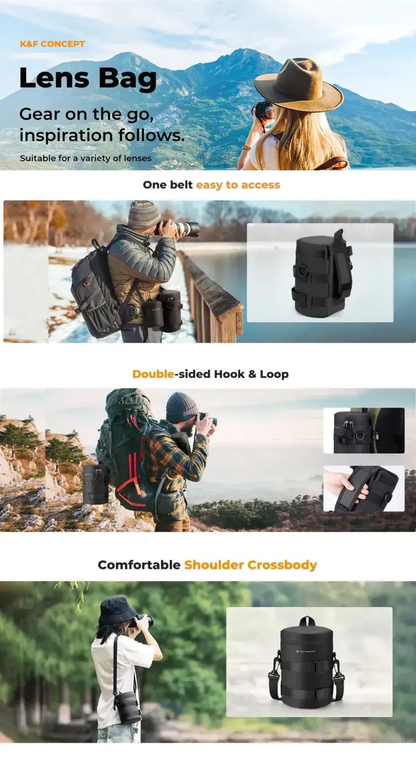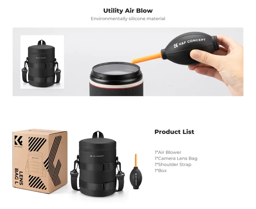 K&F Concept objektív védő tok, L méret, 9x18cm, vállpánt, csepp és porálló zipzár, ráadás pumpa KF-13-202