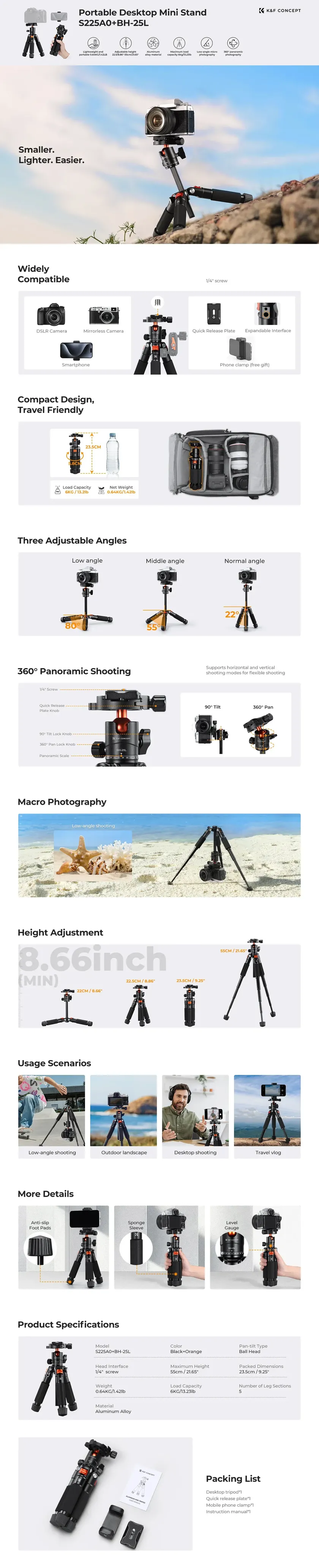 Mini és hordozható: Mindössze 638 g tömegű, 5 szekciós lábakkal rendelkezik. Az összecsukott hossz a gömbfej nélkül 16,5 cm, a gömbfejjel együtt 23,5 cm.