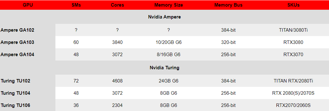 Ha az infóknak hinni lehet, akkor az RTX3080 GA103 GPU-t kap, míg az RTX3070-es pedig a GA104-et. Mondhatni ugyanaz a felállás mint az RTX2080 és RTX2070 sorozatnál, ahol a 2080 kapta a TU104-es processzort, a 2070 pedig a kisebb TU106-osat. A szivárogtató megemlít egy 320 bites buszt az RTX3080-hoz, amely technikailag lehetõvé tenné a 10/20GB-os memória felállást.