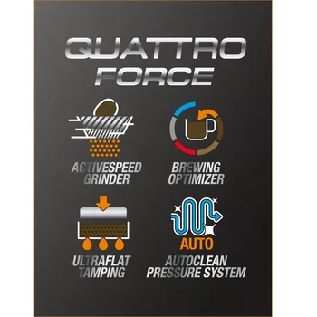 A KRUPS Quattro Force rendszer optimalizálja az eszpresszó készítési folyamat egyes lépéseit a kávészemtől a kávéig: 20%-kal gyorsabb darálás, hidraulikus prés, kompakt gőzölőegység és automatikus tisztítás a hosszantartó teljesítményért.