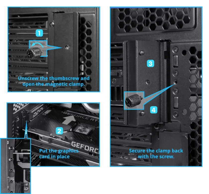 Az új, könnyen állítható magasságú, megereszkedésgátló konzollal (GB-003) érkezik, amely hatékonyan támogatja a nehéz GPU-kat.