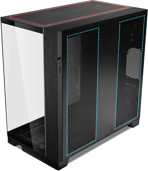 A stílust és a teljesítményt szem előtt tartva az O11D EVO XL felső és oldalsó paneljei is sűrű rácsos alumíniumból készültek, ami luxus megjelenést, ugyanakkor kiváló hűtést biztosít az O11D XL-hez képest.