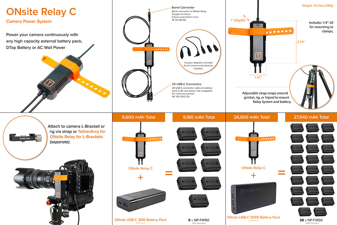 Az ONsite Relay C Camera Power System a legkorszerűbb USB-C technológiát biztosítja a fotósok számára azáltal, hogy megszakítás nélküli áramellátást biztosít a fényképezőgépüknek, és lehetővé teszi a több USB-C akkumulátor közötti „üzem közbeni cserét” („hot swap”), ami biztosítja számukra a fotózáshoz szükséges rugalmasságot.