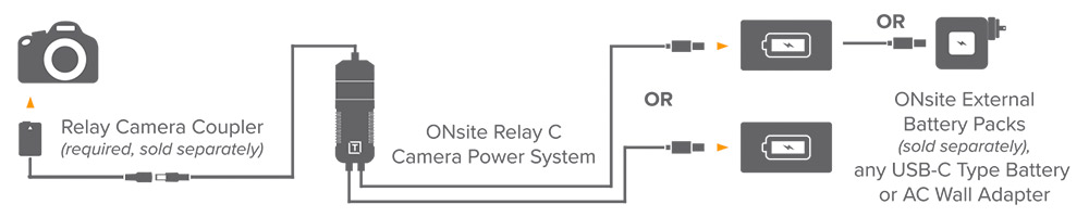 Az ONsite Relay C power bankhoz, fali aljzathoz, és/vagy D-Tap akkumulátorhoz csatlakozik a két USB-C csatlakozás segítségével. Az ONsite Relay másik vége a DSLR vagy tükör nélküli fényképezőgépbe illesztett Relay Camera Couplerhez csatlakozik (külön megvásárolható), hogy megszakítás nélkül táplálja a fényképezőgépet.