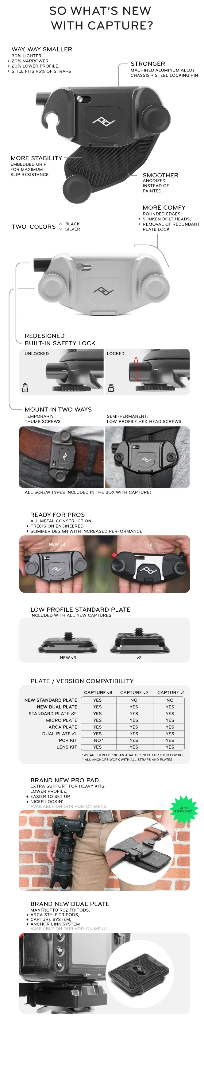 A Capture bármilyen, akár 6,4 cm széles és 2,2 cm vastag pántra rögzíthető, így számos hátizsákhoz, övhöz és táskapánthoz illeszthető. Akár túrázol, utazol, vagy csak útközben fotózol, a Capture biztonságosan rögzíthető a felszerelésedhez, stabil hordási megoldást kínálva fényképezőgépek, objektívek, távcsövek és GoPro kamerák számára, kiegészítő lemezekkel és készletekkel (amelyek külön megvásárolhatók).