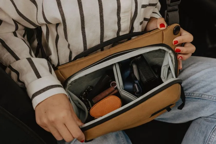 A Everyday Sling belül jól szervezett elrendezéssel és testreszabható párnázott elválasztókkal büszkélkedhet. Ezek az elválasztók a különféle felszerelésekhez igazíthatók, a fényképezőgép-felszerelésektől a személyes tárgyakig. A tágas fő rekesz hatékony rendszerezést és gyors hozzáférést tesz lehetővé a holmijaidhoz.