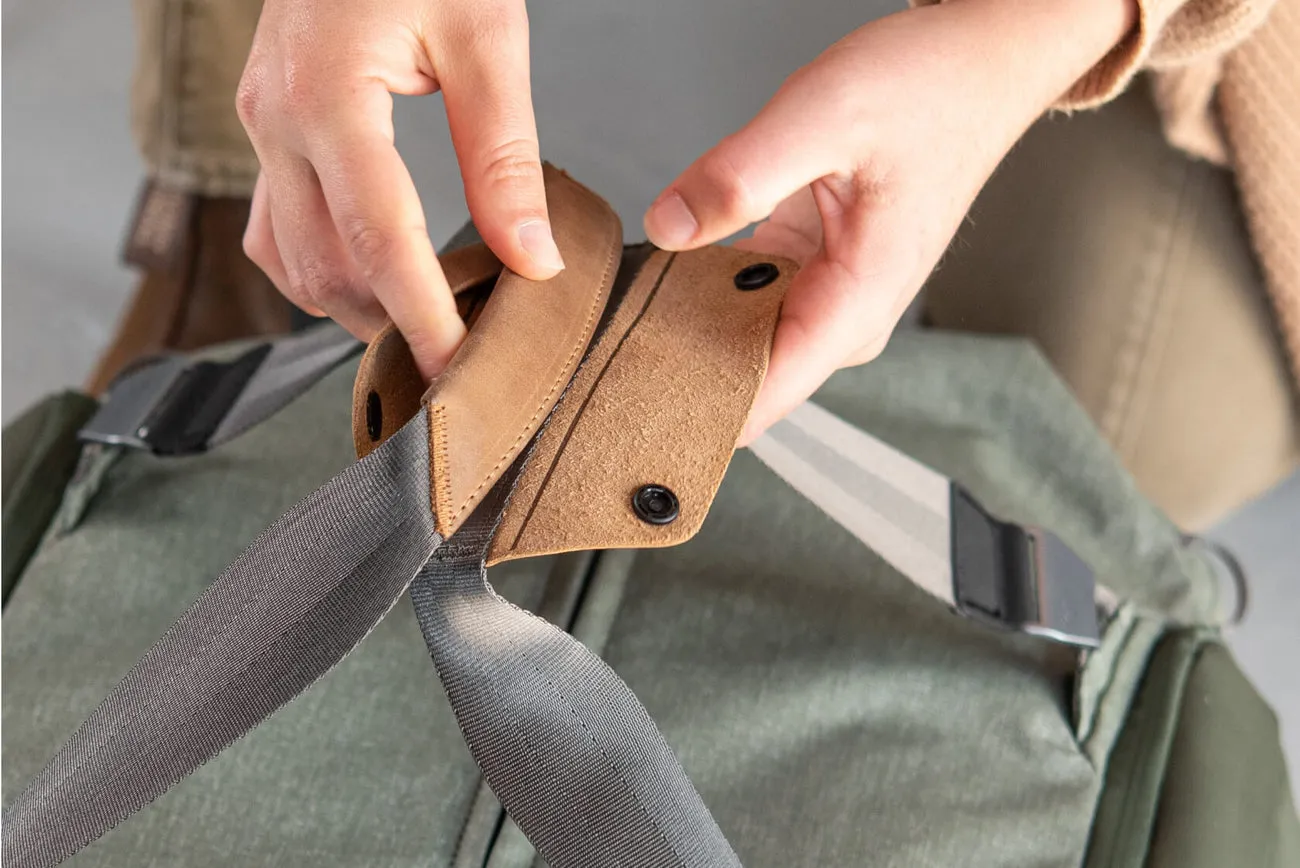 A sokoldalú hordozási lehetőségek közé tartoznak a párnázott fogantyúk mágneses csattal, a párnázott vállpánt vállon vagy heveder stílusban történő hordozáshoz, valamint a Cord Hook™ heveder gyorscsatlakozó rendszer a heveder azonnali eltávolításához és újrakonfigurálásához. A fogantyúk átalakíthatók hátizsák stílusú hordozáshoz, és poggyászátvezetőként is használhatók görgős táskán hordozásához.