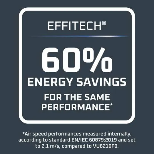Akár 60%-kal kevesebb energiát használ azonos teljesítmény mellett! *Cégen belül mért légáramlás az EN/IEC 60879:2019 szabvány szerint, 2,1 m/s-ra állítva, a VU6210F0 termékhez képest