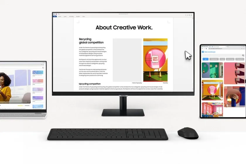 Használd ki a multitaskingban rejlő lehetőségeket egyetlen egér és billentyűzet használatával! Tapasztald meg, milyen is a maximális hatékonyság, ahogyan zökkenőmentesen húzhatsz át tartalmakat a Smart Monitor, egy Galaxy Tab és egy Galaxy mobileszköz között, így egyszerűsítve és gyorsabbá téve a munkafolyamatot.