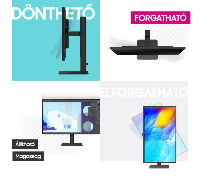 Az állítható magasságú monitor forgatható és dönthető, ezáltal biztosítva a legjobb szöget és a lehető legjobb kihasználhatóságot. Most már 90 fokkal elfordíthatod a képernyőt, amely ideális például hosszabb dokumentumok kevesebb görgetéssel történő megtekintéséhez.