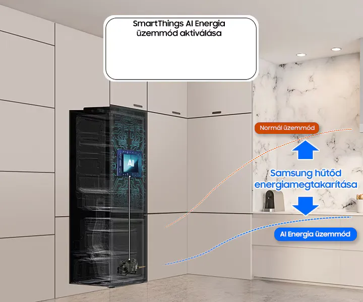 Csökkentsd energiafelhasználásod az AI Energia üzemmóddal**! Ha a becsült villanyszámlád meghaladja az előre beállított célértéket, akkor a hűtő lehetőséget biztosít az energiatakarékos üzemmódra***. Optimalizálja a kompresszor fordulatszámát és a leolvasztási ciklusokat a használati szokásaid és a környezet alapján.