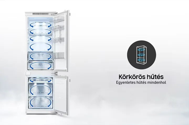 Fontos, hogy az ételeid megfelelően legyenek hűtve - bárhova is teszed őket a hűtődben. A Körkörös hűtés minden rekeszt egyenletesen hűt, saroktól sarokig. Folyamatosan figyeli a belső hőmérsékletet, és a stratégiai pontokon elhelyezett nyílásokon keresztül keringeti a levegőt. Így az élelmiszer az optimális hőmérsékleten, és hosszabb ideig friss marad.