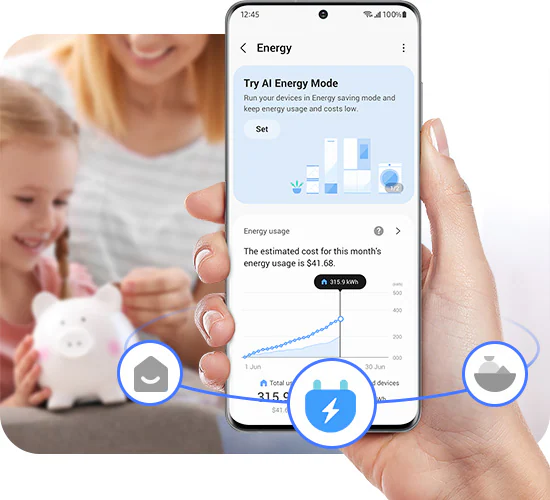 Kezeld energiafelhasználásod, a szén-dioxid kibocsátás csökkentése és energiaköltségeid megtakarítása érdekében. A SmartThings Energia* menüje energiahatékonysági tippeket ad, emellett valós időben figyeli a készülékek energiafogyasztását**, és összehasonlítja azt az előző hónappal. Sőt figyelmeztet is téged, ha esetleg túllépnéd a havi terveidet.