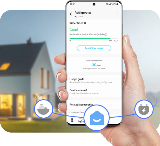 Gondoskodj a hűtődről könnyebben! A SmartThings Otthoni gondoskodás* valós idejű felügyeletet és riasztásokat biztosít. Online ellenőrizheted hűtőd státuszát, például a vízszűrő állapotát. Ezenkívül automatikusan értesít téged, ha az alkatrészek cserére szorulnak, vagy az eszköz problémákat észlel, és megoldást javasol.