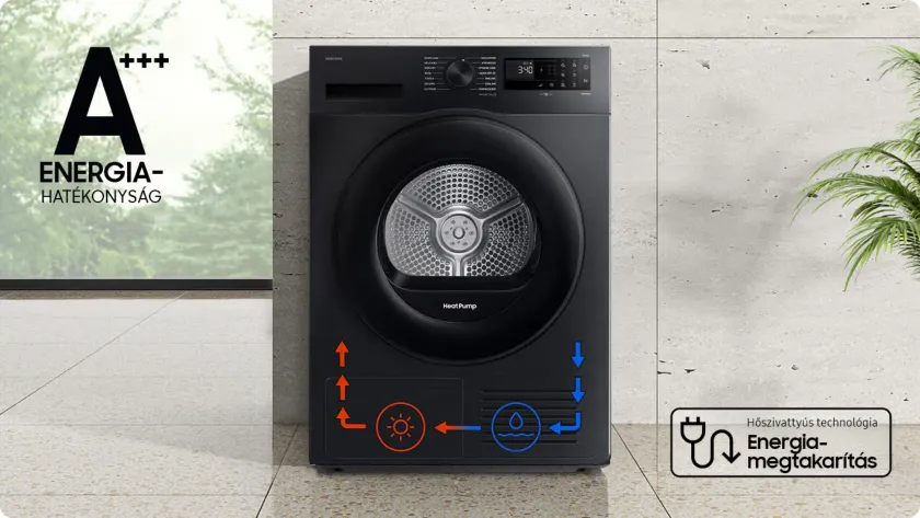 Takaríts meg pénzt a kevesebb villamosenergia-felhasználás által*! A Hőszivattyús technológia a ruhaszárítás hatékonyabb, költségkímélőbb és kíméletesebb módját kínálja. Az A+++ energiahatékonyságot úgy éri el, hogy "hűtőközeget" használ áram helyett a levegő felmelegítésére, és a meleg levegőt keringeti, hogy kevesebb áramot használjon, ezáltal csökkentve az üzemeltetési költséget.