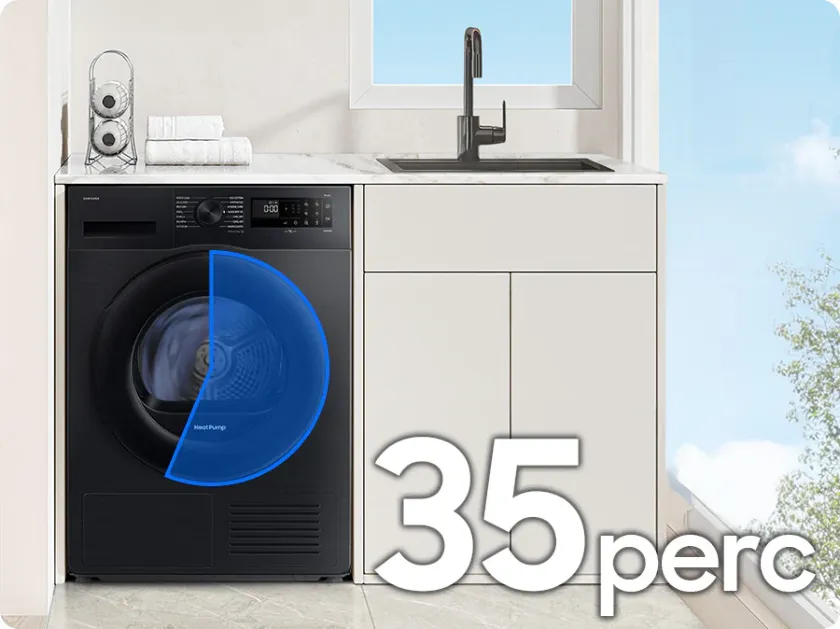 * Az IEC 61121:2013 szerint tesztelve/8 kg mosási terhelés/pamut szekrényszáraz programon hőszivattyúval (DV80F5E4HGW) vagy hőszivattyú nélkül (DV80H4100CW). Az egyéni eredmények eltérhetnek.