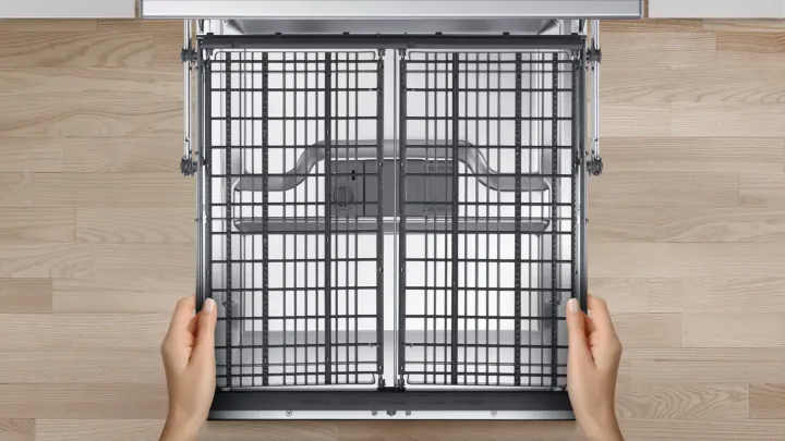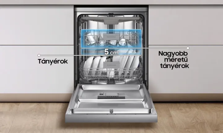 A rugalmasan állítható belső térnek köszönhetően a felső kosár pozícióját 5 cm-rel magasabbra, vagy alacsonyabbra állíthatod. Ezáltal az alsó tér könnyedén alakítható, hogy a különböző méretű és formájú edények és tálak is elférjenek.