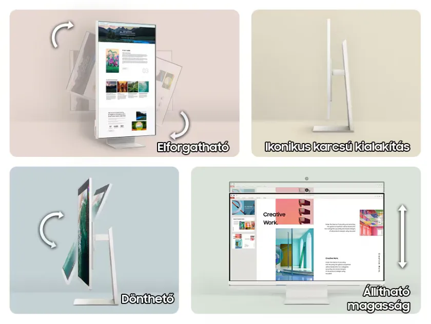 Dobd fel munkaterületedet a Smart monitorral, amely stílusos megjelenést és kényelmet biztosít! Állítható állványának köszönhetően könnyedén döntheted, elforgathatod és változtathatod a magasságát - így kevesebb görgetéssel tekintheted meg a hosszú dokumentumokat.