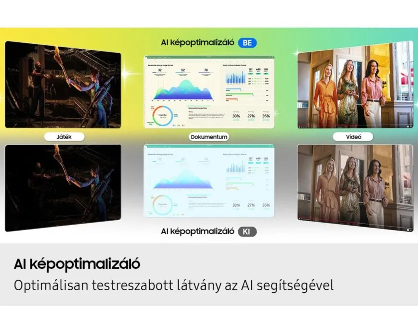 Tapasztald meg az igényeidhez igazított optimális képminőséget! Az AI képoptimalizáló úgy igazítja a képi megjelenítést, hogy kényelmesen dolgozhass dokumentumokon, teljesen elmerülhess a mély fekete árnyalatokban gazdag játékokban, és élénk színekben nézhess videókat.
