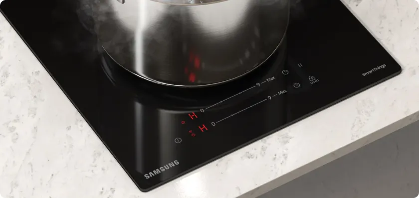 * Vezeték nélküli hálózat, Samsung Account és a Samsung SmartThings App szükséges. A Samsung SmartThings App támogatja a Samsung okostelefonokra optimalizált Android OS 8.0 (Oreo) vagy újabb operációs rendszert. Ez az App támogatja az iOS 13 vagy újabb iPhone modelleket is. A SmartThings App elérhető az App Store-ban és a Play Store-ban.** Elérhető bizonyos nyelveken, többek között angolul, franciául, németül, olaszul és spanyolul.*** Csak felügyelet áll rendelkezésre. A főzőlap okostelefonon keresztül nem kapcsolható be/ki.**** Csak az Egyesült Királyságban és Németországban érhető el.