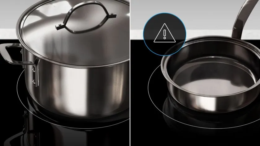 Amikor egy edényt vagy serpenyőt a főzési zónára helyezel, az azonnal felismeri, hogy az átmérő és a méret megfelel-e az adott zónának. Ha ezek az edények a zóna kevesebb, mint 60% -át fedik le, akkor egy üzenettel figyelmeztet téged, hogy használj másik edényt.